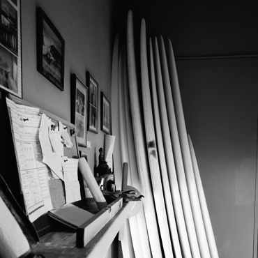 L’aventure de Minvielle Surfboard a débuté à bord d’une 4L avec quelques copains, équipés des premières planches faites maison. Les pains de mousse achetés chez Barland étaient façonnés dans un garage, avec une connaissance balbutiante des techniques de shape et un matériel de fortune. La raclette à vitres utilisée pour le glaçage fonctionnait plutôt bien ; parfois ça flottait, mais pas toujours. Un constat s’est imposé : il fallait des cotes… L’acquisition de la planche d’un surfeur australien a permis d’avoir un modèle à reproduire. Ces premières planches sont le reflet d’une époque un peu particulière, où tout était à construire autour du surf. Les spots restaient souvent déserts, les combinaisons en néoprène de Jack O’Neill ne s’étaient pas encore démocratisées et le surf n’avait rien d’un loisir occasionnel ; la pratique relevait alors d’une passion pionnière.