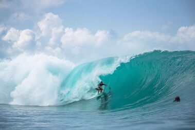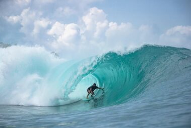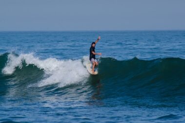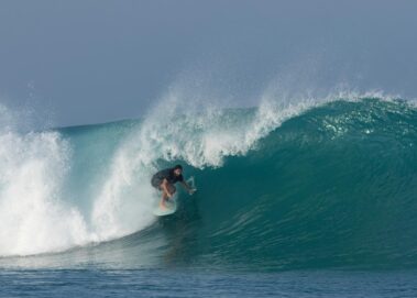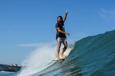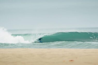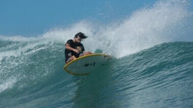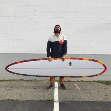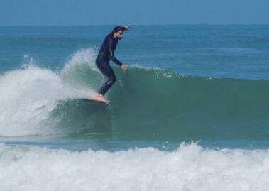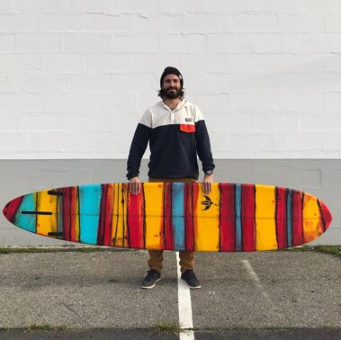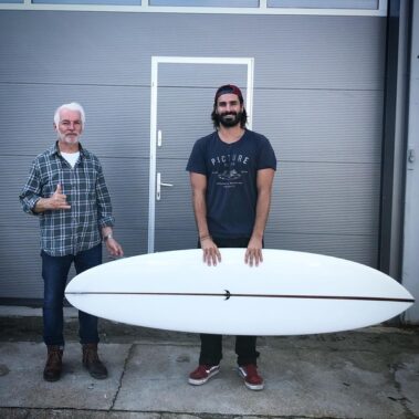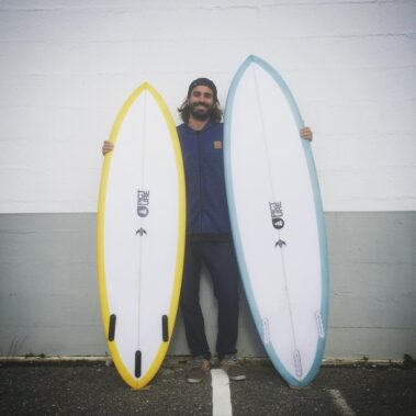 Damien est un spécialiste du longboard qui ne cesse de prendre de l’envergure dans sa discipline. Il collabore depuis de nombreuses années avec Alain Minvielle pour concevoir des planches qui correspondent à l’évolution de son style et à l’envolée de ses rêves de vagues. Très ancré dans un surf rétro, il partage avec le shaper une passion pour les courbes harmonieuses qui se confondent aux flots sans les dénaturer, en exploitant chaque onde de leurs possibilités. Entraîné dans ses premières rames par son entourage à l’âge de 11 ans, il débute par le shortboard, puis une blessure au genou l’amène sur la voie d’un surf aux manœuvres moins agressives pour ses articulations et plus respectueuses de sa personnalité. En longboard, il obtient le titre de Champion d’Europe en 2010, et se classe 5ème aux Championnats du Monde de 2011. Mais les victoires en compétition, bien qu’elles soient des vecteurs de progression technique, ne sont pas la finalité ultime de son surf. Son appel du large est bien plus vaste et profond ; c’est avec le statut de free-surfeur qu’il dessinera un parcours dans lequel le suivront sponsors et professionnels du monde de la glisse, ainsi qu’un public de plus en plus large.